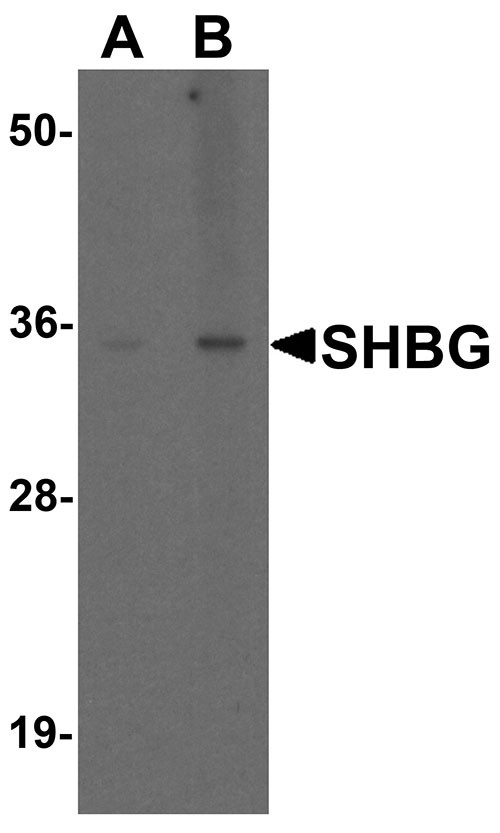 Western blot analysis of SHBG in human liver tissue lysate with SHBG antibody at (A) 1 and (B) 2 μg/ml.