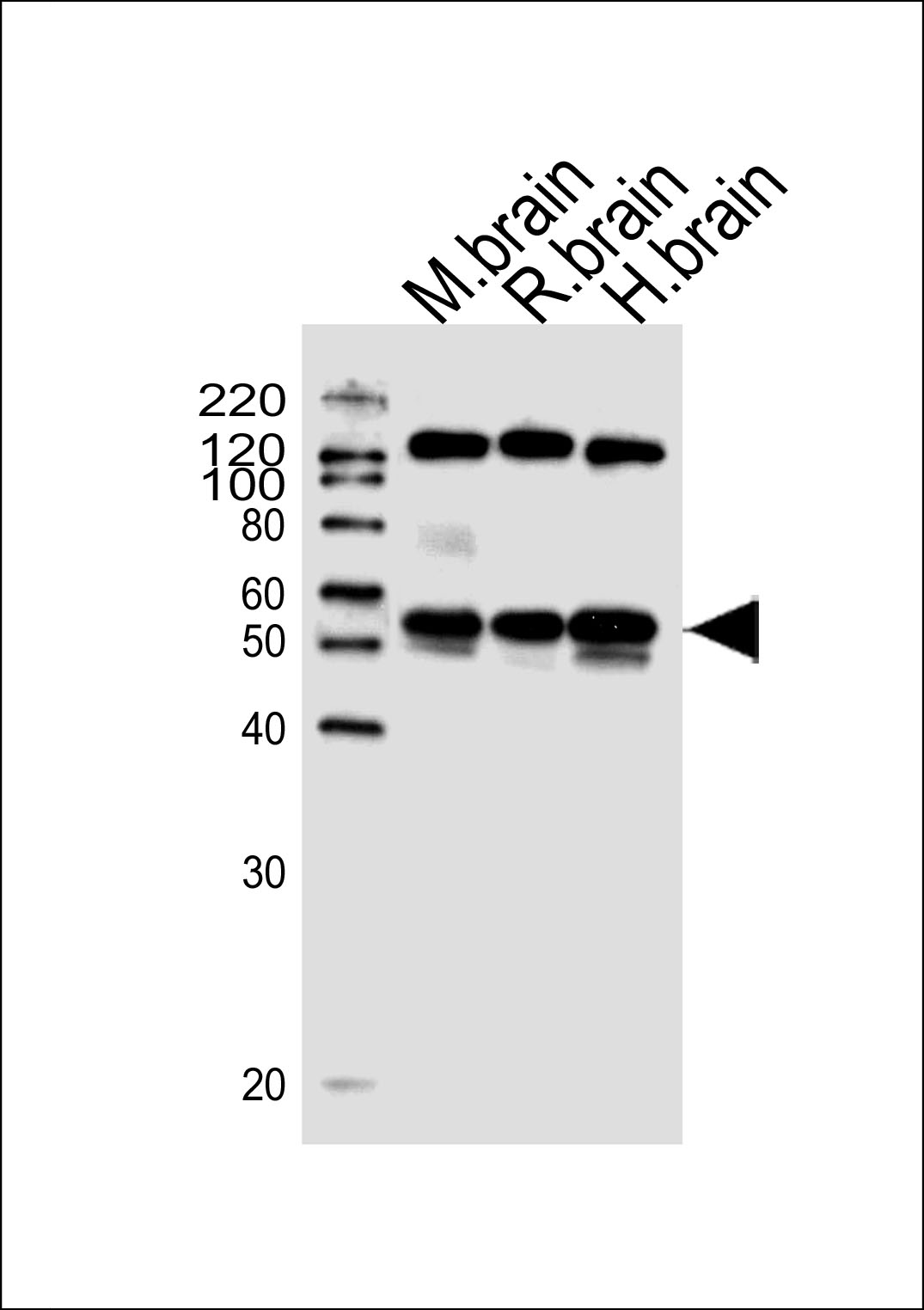 Western blot analysis of lysates from mouse brain, rat brain and human brain tissue lysate(from left to right), using HTR1B Antibody( APG01375G). APG01375G was diluted at 1:1000 at each lane. A goat anti-rabbit IgG H&L(HRP) at 1:5000 dilution was used as the secondary antibody. Lysates at 35ug per lane.