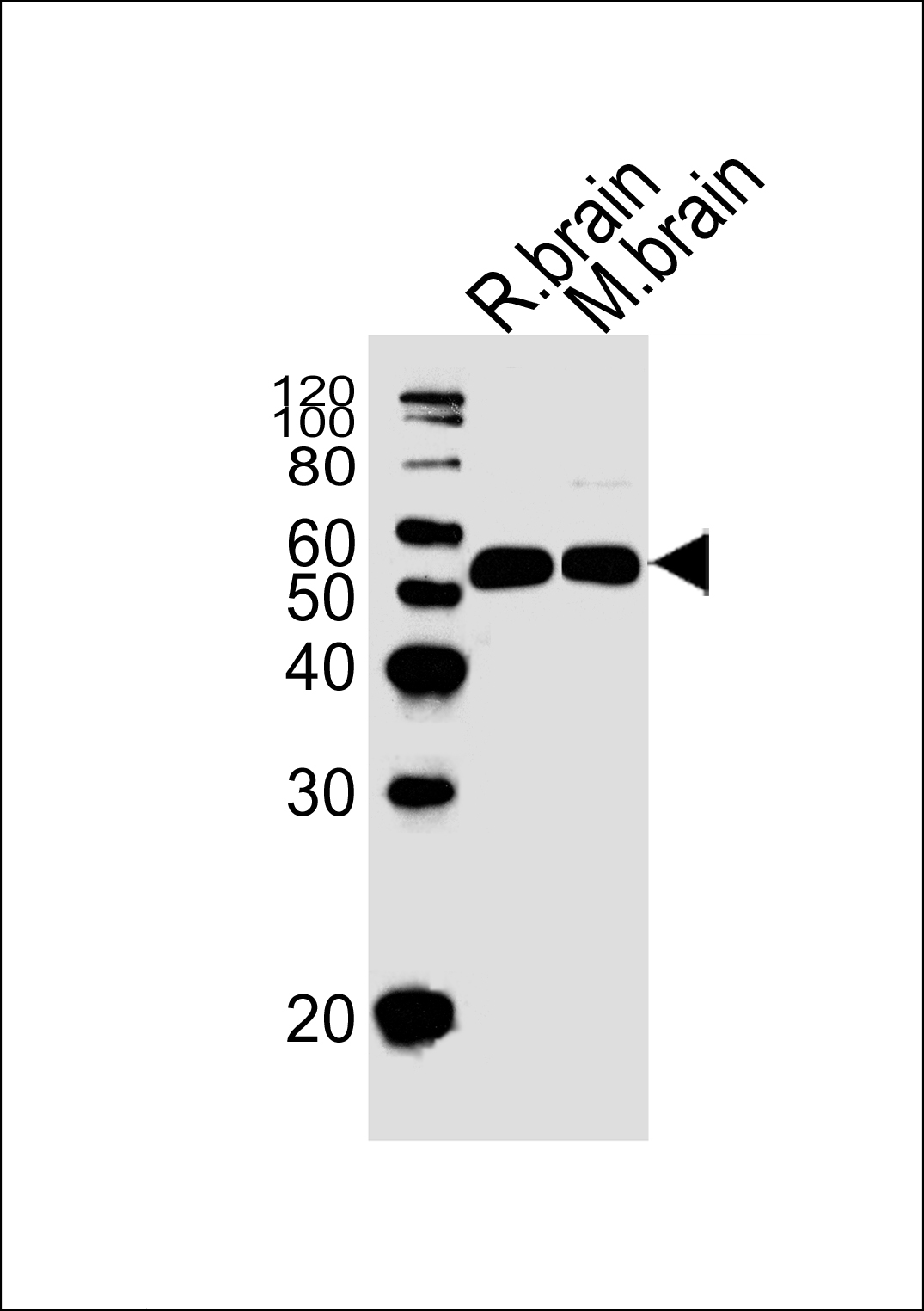 Western blot analysis of lysates from rat brain and mouse brain tissue lysate(from left to right), using Sstr1 Antibody( APR13446G). APR13446G was diluted at 1:1000 at each lane. A goat anti-rabbit IgG H&L(HRP) at 1:5000 dilution was used as the secondary antibody. Lysates at 35ug per lane.