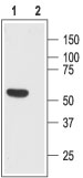 Western blot analysis of rat brain lysate: 1. Anti-Somatostatin Receptor Type 1 (extracellular) antibody ( APR13446G), (1:200). 2. Anti-Somatostatin Receptor Type 1 (extracellular) antibody, preincubated with the control peptide antigen. |