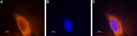 Expression of Na 1.3 in rat DRG primary cells Immunocytochemical staining of paraformaldehyde-fixed and permeabilized rat dorsal root ganglia (DRG) primary culture. A. DRG cells were stained using Anti-Na 1.3 antibody ( AMM06563G), (1:200) followed by goat anti-rabbit-AlexaFluor-555 secondary antibody. B. Nuclear staining of cells using the cell-permeable dye Hoechst 33342. C. Merged image of panels A and B. |