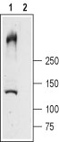 Western blot analysis of rat skeletal muscle lysates: 1. Anti-Ryanodine Receptor 1 antibody ( AMR09795G), (1:200). 2. Anti-Ryanodine Receptor 1 antibody, preincubated with the control peptide antigen.