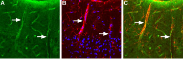 Expression of Aquaporin 4 in rat brain Immunohistochemical staining of rat brain using Anti-Aquaporin 4 (300-314) antibody ( APR15003G), (1:200). A. Aquaporin 4 (green) is detected in blood vessels in layers 1-3 of rat neocortex. B. Astrocytic processes were stained using mouse anti glial fibrillary acidic protein (GFAP) (red) and DAPI (blue) was used to delineate the cortical layers. C. Merge of aquaporin 4 and GFAP shows overlap along blood vessels (arrows) in agreement with the role of astrocytes and aquaporin 4 in regulation of the blood brain barrier.