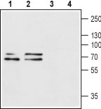 Western blot analysis of rat brain (lanes 1 and 3) and mouse brain (lanes 2 and 4) lysates: 1, 2. Anti-P2X1 Receptor (extracellular) antibody ( APR11280G), (1:200). 3, 4. Anti-P2X1 Receptor (extracellular) antibody, preincubated with the control peptide antigen.
