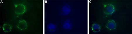 Expression of P2X1 in human SH-SYS5 cells Immunocytochemical staining of human intact living SH-SYS5 cells. A. Extracellular staining of cells with Anti-P2X1 (extracellular) antibody ( APR11280G), (1:50) followed by goat anti-rabbit-AlexaFluor-488 secondary antibody. B. Nuclear staining DAPI as the counterstain. C. Merged images of A and B.