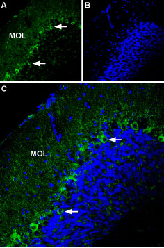 Expression of P2X1 in mouse cerebellum Immunohistochemical staining of mouse cerebellum using Anti-P2X1 Receptor (extracellular) antibody ( APR11280G). A. Most of P2X1 labeling (green) appears in fine processes in the molecular layer (MOL) and in Purkinje cells (arrows show examples). B. DAPI is used as the counterstain (blue). C. Merge of A and B. |