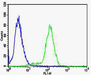 Flow cytometric analysis of Jurkat cells using Park7 (DJ-1) Antibody(green, APR17720G) compared to an isotype control of rabbit IgG(blue). APR17720G was diluted at 1:40 dilution. An Alexa Fluor? 488 goat anti-rabbit lgG at 1:400 dilution was used as the secondary antibody.