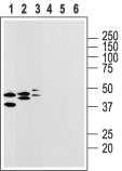 Western blot analysis of rat heart membranes (lanes 1,4), rat brain (lanes 2,5) and rat lung lysates (lanes 3,6): 1-3. Anti-P2Y14 Receptor (extracellular) antibody, ( APR17720G), (1:200). 4-6. Anti-P2Y14 Receptor (extracellular) antibody, preincubated with the control peptide antigen. |