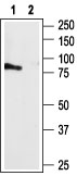 Western blot analysis of rat brain membranes: 1. Anti-P2Y4 Receptor antibody ( APR17721G), (1:300). 2. Anti-P2Y4 Receptor antibody, preincubated with the control peptide antigen.