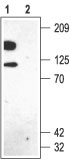 Western blot analysis of rat brain membranes: 1. Anti-K 2.1 antibody ( AMM06222G), (1:500). 2. Anti-K 2.1 antibody, preincubated with the control peptide antigen.