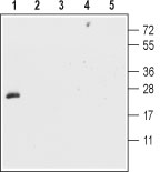 Western blot analysis using Anti-CNTF on: 1. human CNTF ( C-240), 20ng. 2. hCardiotrophin-1 ( C-200), 20ng. 3. hLIF ( L-200), 20ng. 4. mIL-6 ( I-220), 20 ng. 5. human CNTF ( C-240), 20ng. Lanes 1-4. Anti-CNTF antibody ( APR11614G), (1:200). Lane 5. Anti-CNTF, preincubated with the control peptide antigen. The specificity of the antibody is demonstrated in that it specifically recognizes CNTF while it does not reacts with the related cytokines Cardiotrophin-1, LIF and IL-6.