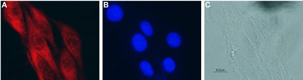 Expression of CNTF in rat C6 glioma cells Immunocytochemical staining of fixed and permeabilized rat C6 glioma cells. A. Cells were stained with Anti-CNTF antibody ( APR11614G), (1:200), followed by goat anti-rabbit-DyLight-594 secondary antibody (red). B. Cell nuclei were visualized with the membrane-permeable DNA dye Hoechst 33342 (blue staining). C. Live view of the cells. |