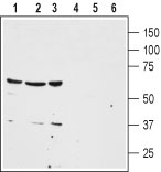 Western blot analysis of human colon cancer HT-29 (lanes 1 and 4), human lung small cell carcinoma NCI-H526 (lanes 2 and 5) and human breast adenocarcinoma MDA-MB-468 (lanes 3 and 6) cell lysates: 1-3. Anti-Neurotensin Receptor 1 (extracellular) antibody ( AMM06650G), (1:200). 4-6. Anti-Neurotensin Receptor 1 (extracellular) antibody, preincubated with the control peptide antigen.