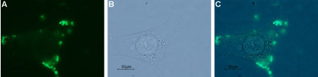 Expression of Neurotensin Receptor 1 in a human breast adenocarcinoma cell line Immunocytochemical staining of a human breast adenocarcinoma cell line. A. Live intact human MCF-7 cells were stained with Anti-Neurotensin Receptor 1 (extracellular) antibody ( AMM06650G), (1:20), followed by Alexa 488-conjugated goat anti-rabbit antibody (green staining). B. Live view of the cells. C. Merge of (A) and (B). |