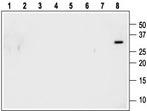 Western blot analysis using Anti-proNT-3 antibody ( APR12981G) (1:600): 1. hNT-3 ( N-260), (200 ng). 2. hNT-4 ( N-270), (200 ng). 3. mNGF 2.5S (Grade II) ( N-100), (200 ng). 4. hß-NGF ( N-245), (200 ng). 5. hBDNF ( B-250), (200 ng). 6. proNGF (WT-mouse) ( N-250), (200 ng). 7. proBDNF (WT-mouse) ( B-240), (200 ng). 8. recombinant proNT-3 10 ng.