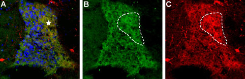 Expression of proNT-3 in rat brain Immunohistochemical staining of rat Islands of Calleja (IOC) using Anti-proNT-3 antibody ( APR12981G). A. proNT-3 staining (green) overlaps neuronal nitric oxide synthase (nNOS red) while a cluster of cells covers a part of the island (DAPI blue counterstain) but not a cell-poor area (star). B. The distribution of proNT-3 is shown alone. Note that staining is more intense in the cell poor area demarcated by white line. C. The distribution of neuronal NOS is most intense in the cell-poor region. |
