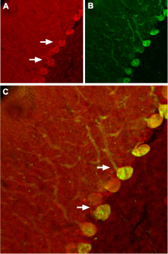 Expression of Nogo receptor in rat cerebellum Immunohistochemical staining of rat cerebellum using Anti-Nogo Receptor (extracellular) antibody ( AMM06739G).A. Nogo receptor (red) appears in Purkinje cells (arrows). B. Staining of Purkinje nerve cells with mouse anti-calbindin D28K (a calcium binding protein, green). C. Confocal merge of Nogo receptor and calbindin D28K demonstrates some co-localization of these proteins.