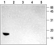 Western blot analysis using Anti-NT-3 antibody (1:1000) (1-4) or anti-NT-3 antibody, preincubated with the control antigen peptide (5): 1. hNT-3 ( N-260), 10 ng 2. hß-NGF ( N-245), 100 ng 3. hNT-4 ( N-260), 100 ng 4. hNT-3 ( N-260), 10 ng 5. Control peptide