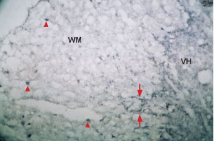 Expression of NT-3 in mouse spinal cord Immunohistochemical staining of mouse spinal cord using Anti-NT-3 antibody ( AMM06838G). The spinal ventral horn was stained diffusely with some extensions (arrows) into the white matter (WM). In the WM there were NT-3 immunoreactive cells that were probably glia (triangles). |
