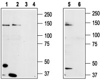 Western blot analysis of prostate carcinoma cell lines; DU145 (lanes 1,3), LNCaP (lanes 2,4) and mouse-TRPM8 transfected HEK-293 (lanes 5,6) cell lysates : 1,2,5. Anti-TRPM8 (extracellular) antibody ( ACC-049), (1:200). 3,4,6. Anti-TRPM8 (extracellular) antibody, preincubated with the control peptide antigen.