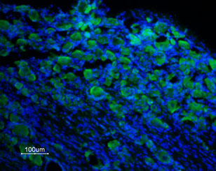 Expression of TRPM8 in rat DRG Immunohistochemical staining of rat dorsal root ganglion (DRG) frozen sections using Anti-TRPM8 (extracellular) antibody ( ACC-049), (1:100). TRPM8 is expressed in DRG neurons. Hoechst 33342 is used as the counterstain.