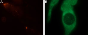 Expression of TRPM8 in LNCaP prostate carcinoma cell line Immunocytochemical staining of LNCaP cells with Anti-TRPM8 (extracellular) antibody ( ACC-049). A. Extracellular staining of intact LNCaP cells with Anti-TRPM8 (extracellular) antibody (1:100), followed by goat anti-rabbit-AlexaFluor-550 (red), (x100). B. Intracellular staining of LNCaP cells with Anti-TRPM8 (extracellular) antibody (1:1000), followed by goat anti-rabbit-AlexaFluor-488 (green), (x100). |