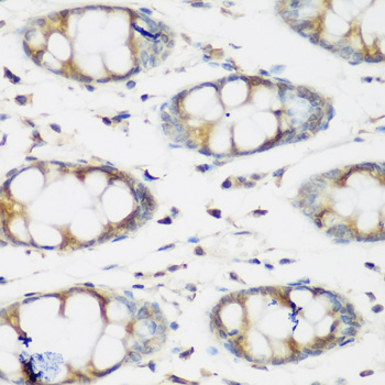 Immunohistochemistry of paraffin-embedded human colon using BMP2 antibody.