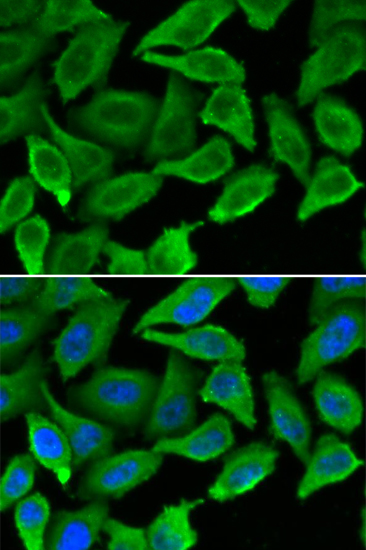 Immunofluorescence analysis of A549 cells using IFNA1 antibody. |