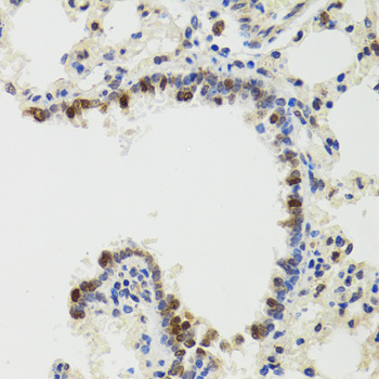 Immunohistochemistry of paraffin-embedded rat lung using IKBKG antibody.