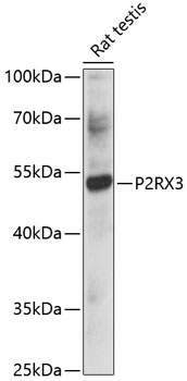Western blot analysis of extracts of rat testis, using P2RX3 antibody. |
