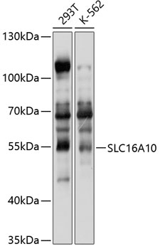 Western blot analysis of extracts of various cell lines, using SLC16A10 antibody. |
