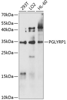 Western blot analysis of extracts of various cell lines, using PGLYRP1 antibody. |