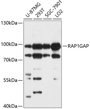 Western blot analysis of extracts of various cell lines, using RAP1GAP antibody. |