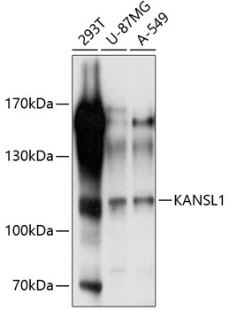 Western blot analysis of extracts of various cell lines, using KANSL1 antibody. |