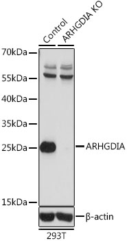 Western blot analysis of extracts from normal (control) and ARHGDIA knockout (KO) 293T cells, using ARHGDIA antibody.