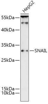 Western blot analysis of extracts of HepG2 cells, using SNAI1 antibody.