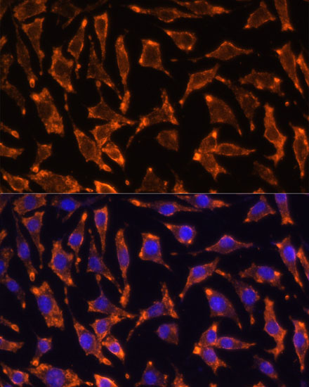 Immunofluorescence analysis of L929 cells using TNFRSF11A Polyclonal Antibody. |