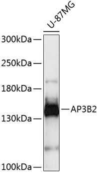 Western blot analysis of extracts of U-87MG cells, using AP3B2 antibody. |