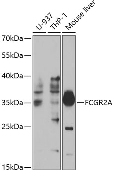 Western blot analysis of extracts of various cell lines, using FCGR2A antibody.