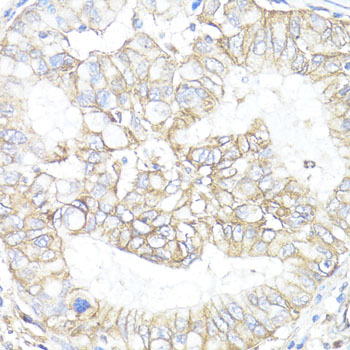 Immunohistochemistry of paraffin-embedded human liver cancer using ATP1B1 antibody.