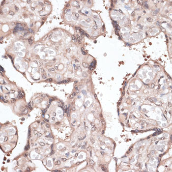Immunohistochemistry of paraffin-embedded human placenta using CCNE2 antibody.