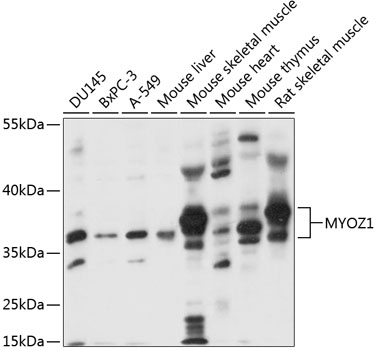 Western blot analysis of extracts of various cell lines, using MYOZ1 antibody. |