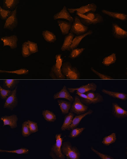 Immunofluorescence analysis of U-2 OS cells using PDE6D Polyclonal Antibody. |
