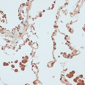 Immunohistochemistry of paraffin-embedded human lung using RB1 antibody.