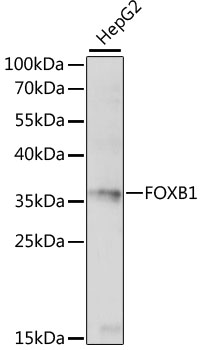 Western blot analysis of extracts of HepG2 cells, using FOXB1 antibody. |