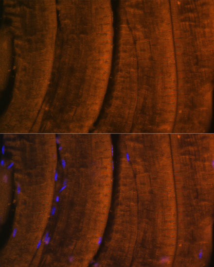 Immunofluorescence analysis of mouse skeletal muscle using MYH2 Polyclonal Antibody. |