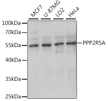 Western blot analysis of extracts of various cell lines, using PPP2R5A antibody. |