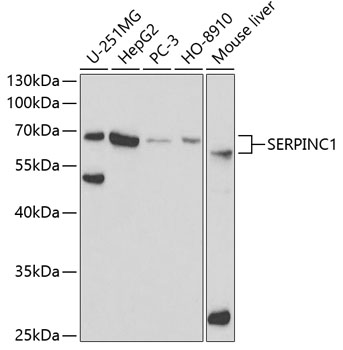 Western blot analysis of extracts of various cell lines, using SERPINC1 antibody.