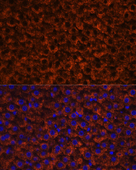 Immunofluorescence analysis of rat liver using Factor IX / F9 Polyclonal Antibody.