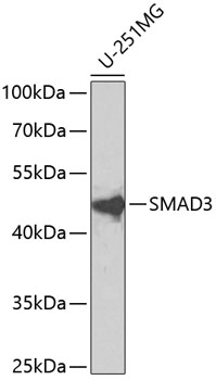 Western blot analysis of extracts of U-251MG cells, using SMAD3 antibody.